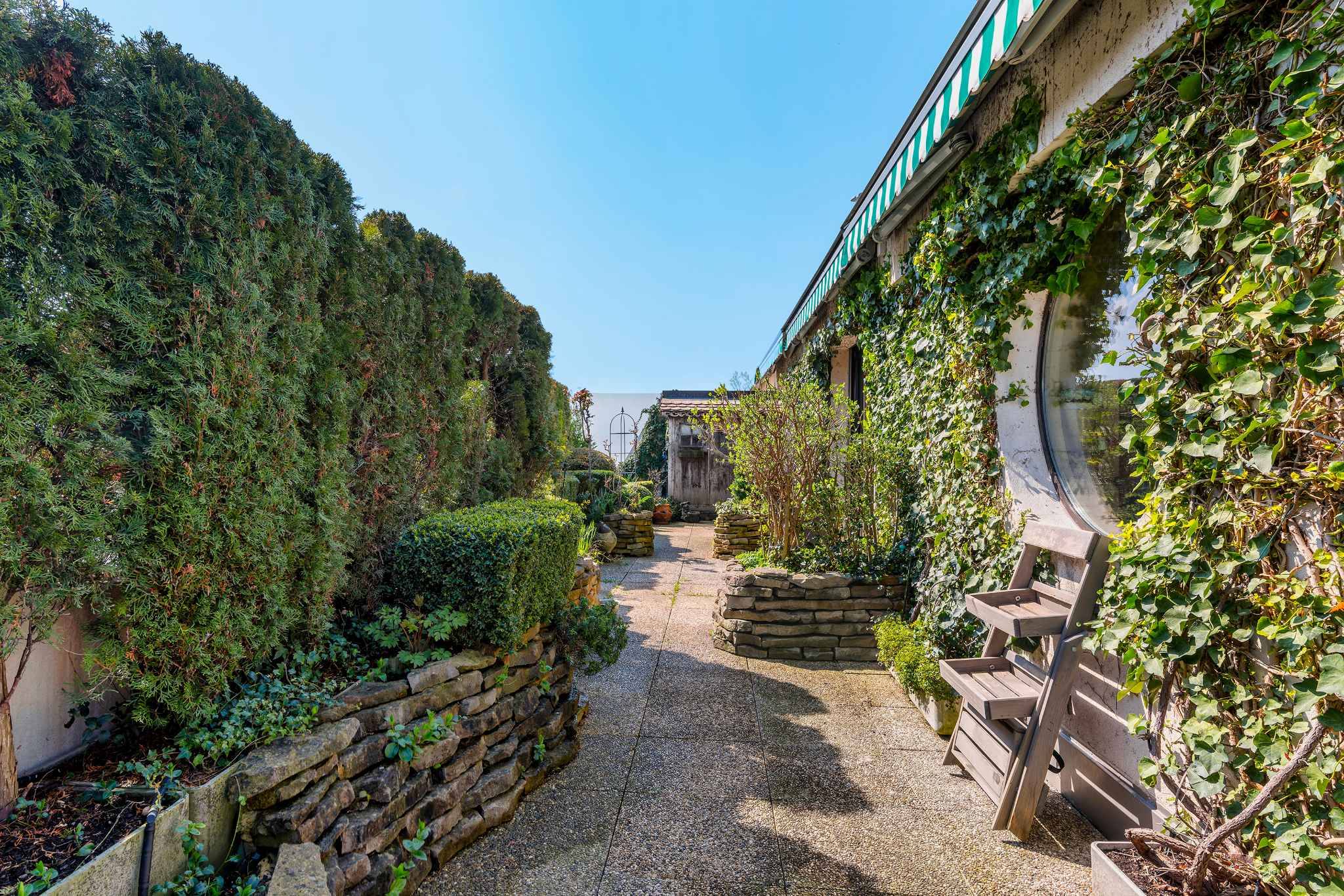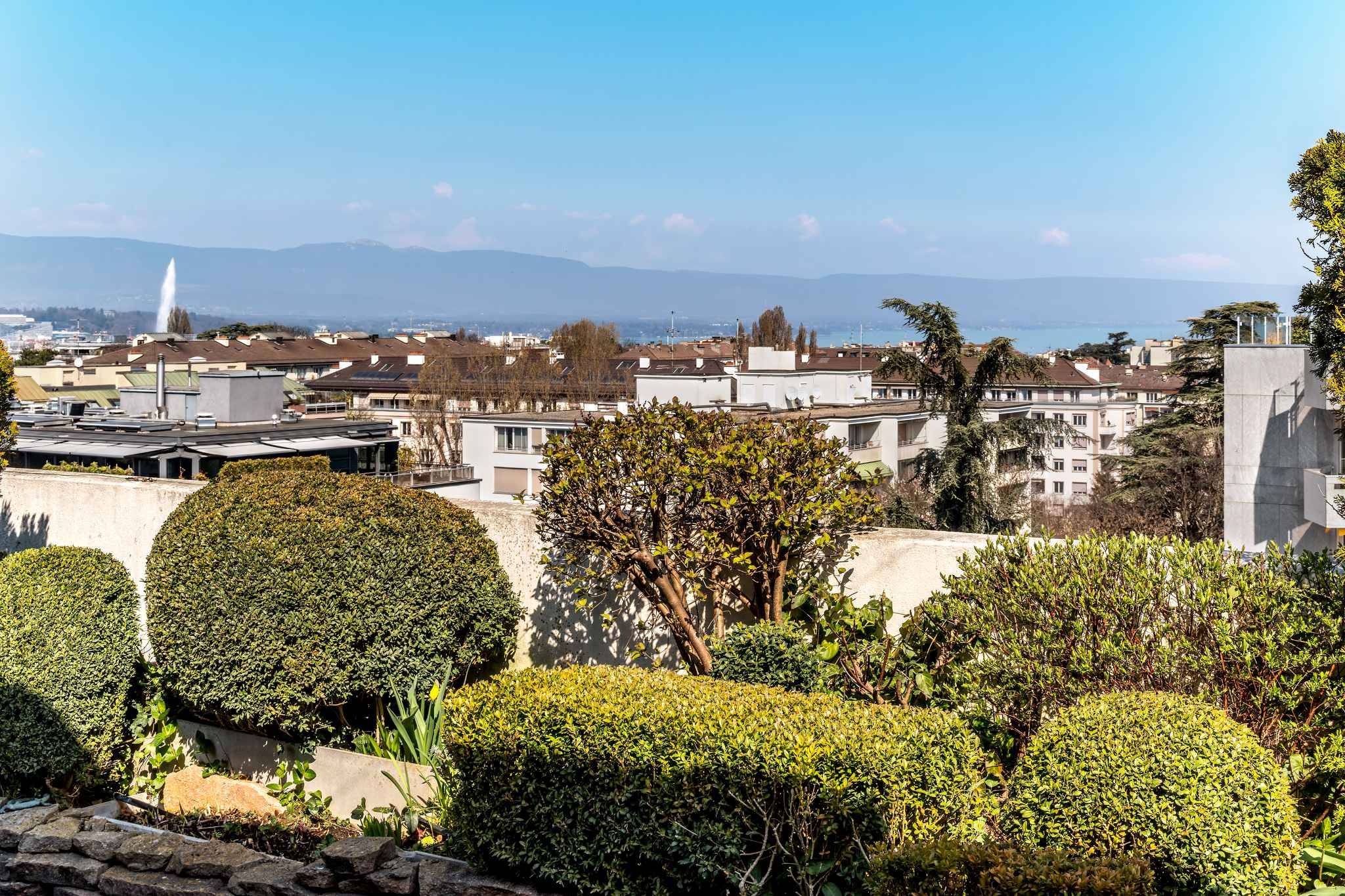 La terrasse verdoyante de plus de 140 m2 est accessible depuis chaque pièce de l'appartement, elle offre une vue imprenable sur la ville et les montagnes et dispose d'une cuisine d'été permettant de profiter de l'ensoleillement optimal.