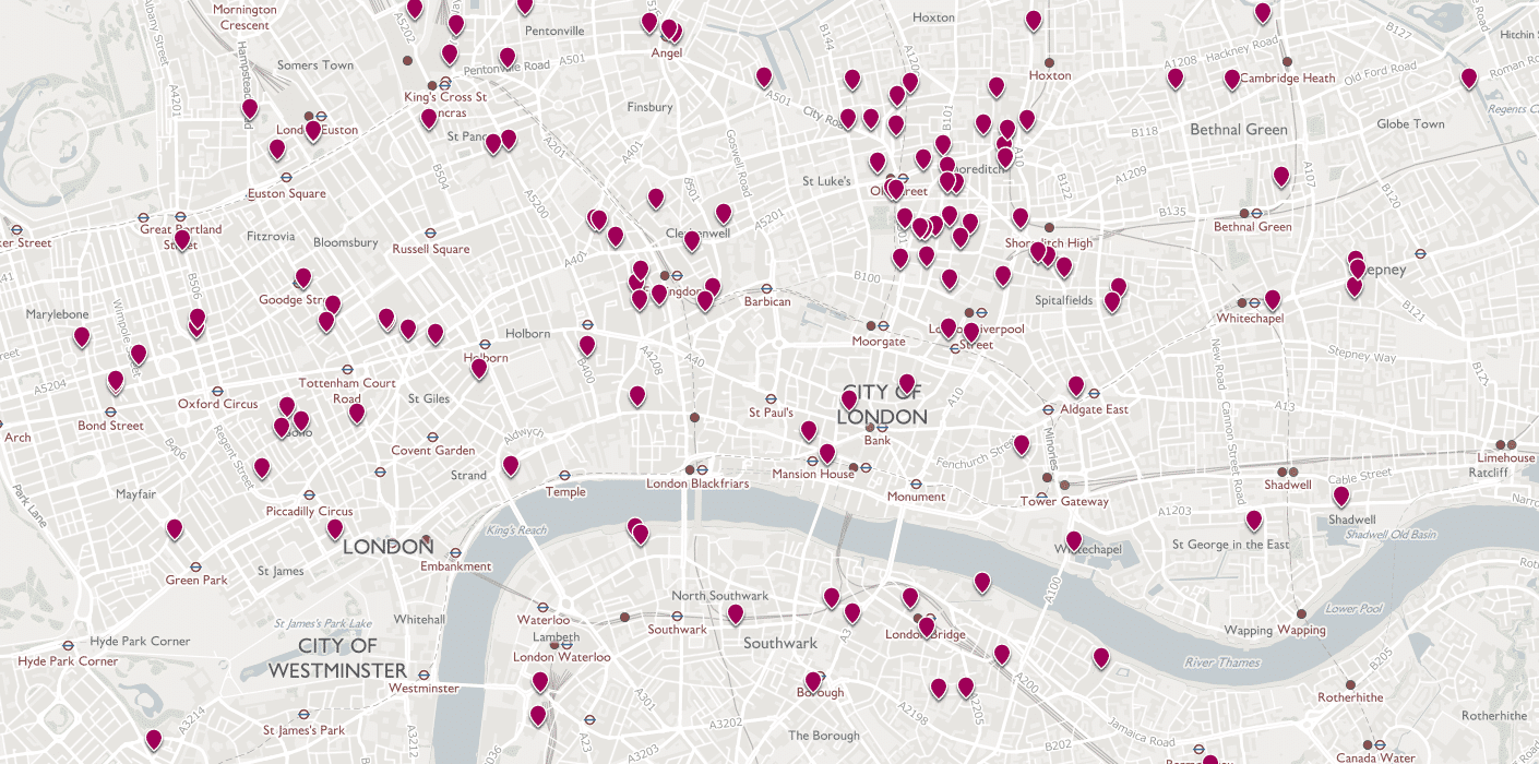 Carte interactive des espaces de coworking dans la ville de Londres, Royaume-Uni (capture d’écran, mars 2018) – LEAP, a Mayor of London initiative. (Crédits: LEAP )