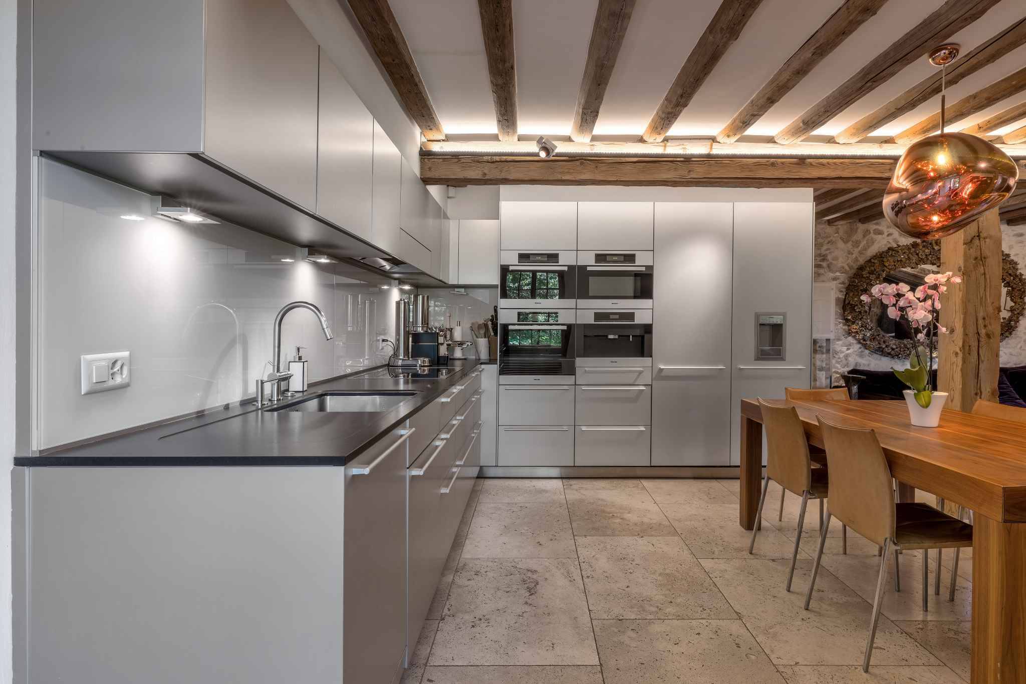 Cuisine Bulthaup entièrement équipée ouverte sur séjour avec cheminée fonctionnelle
