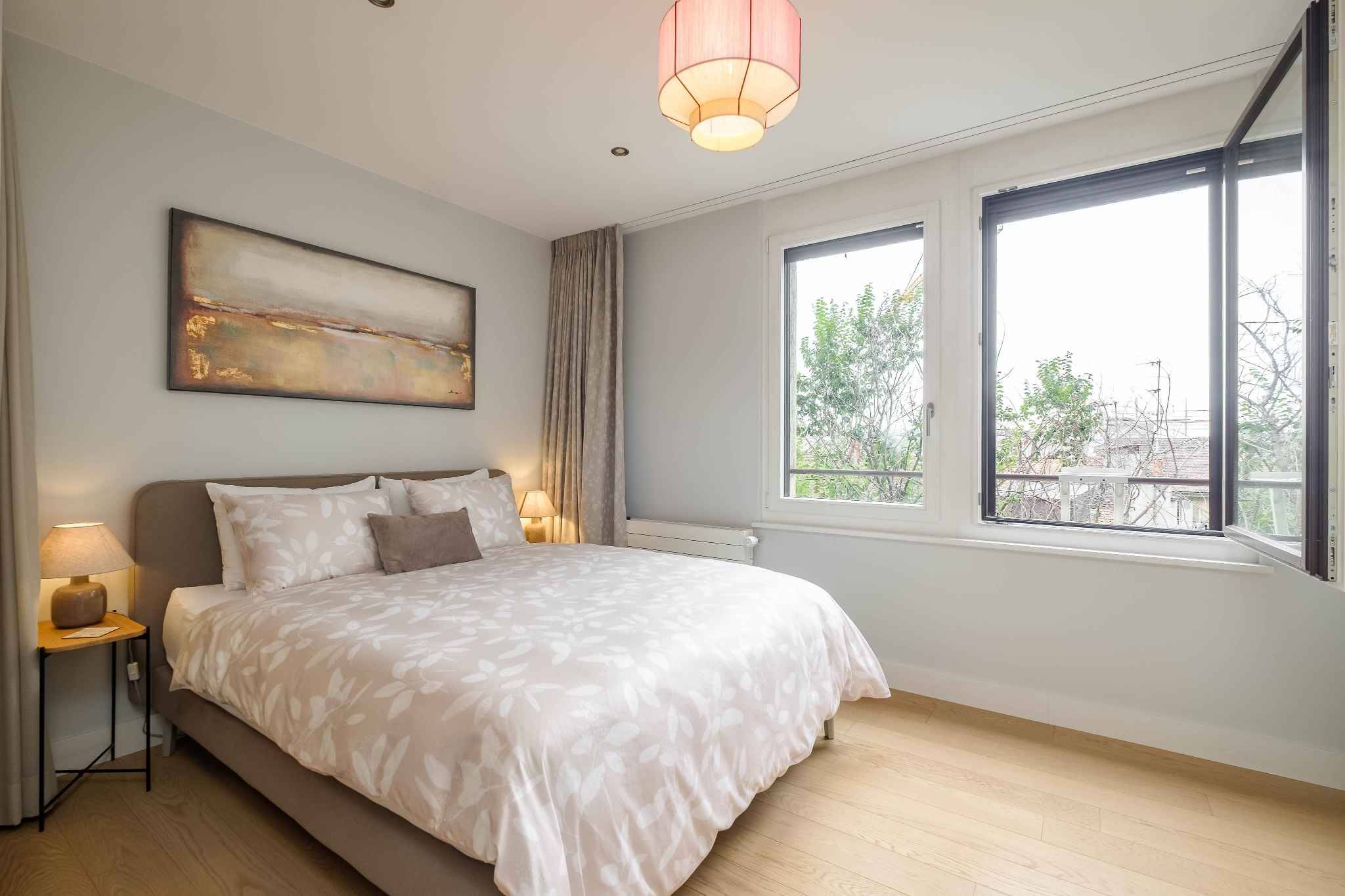 L'appartement est équipé de stores et de toiles solaires électriques et l'immeuble bénéficie des équipements suivants : ascenseur, vidéophone, local à vélos, local à poussettes et places de parking visiteurs en sous-sol.