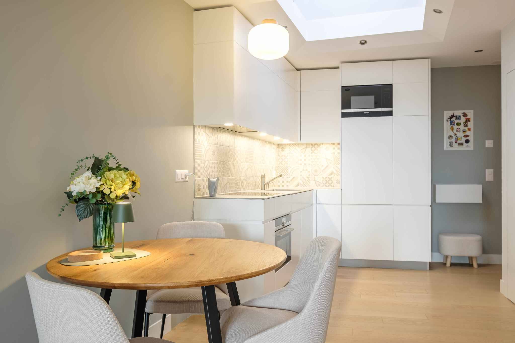 The day area features a contemporary open-plan kitchen with central island, a spacious living and dining area, and direct access to the south-west facing loggia.
